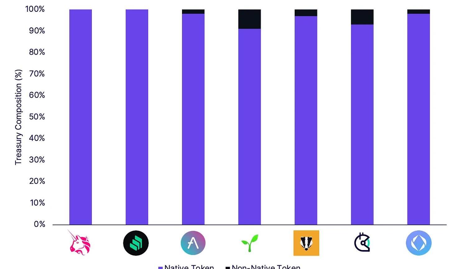 DAO的國庫資產支持著組織的產品開發、人員擴張及長久發展。DAO資產管理的三原則為:a.以永續期限為目標;b.確保正向的現金流;c.資產多元化。最初,DAO的國庫資產被定義為項目原生代幣的未發行部分。原生代幣的市值決定了DAO的市場地位。然而,加密貨幣的高波動性與周期性,使得代幣市值不能如實地體現DAO的實際購買力。治理者們意識到僅僅依賴原生代幣所組成的國庫,并不能支撐DAO長久穩定的發展。構建能實際體現DAO購買力的資產表,需要將單一的原生資產替換成多元化的資產組成。目前常見的解決方案是在資產中加入:目前常見的解決方案是在資產中加入:a.穩定幣;b.藍籌加密資產;c.其他低相關性加密資產。