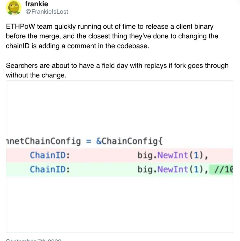 ChainID最初是在EIP-155中引入的,用于緩解以太坊和以太坊經典鏈之間的重放攻擊;前者的ChainID保持在1,而EthereumClassic移動到61。在撰寫本文時,EthPoW的開發者仍未在其代碼庫中將分叉的ChainID從1進行更新——這意味著EthPoW即將推出與以太坊相同的ChainID。