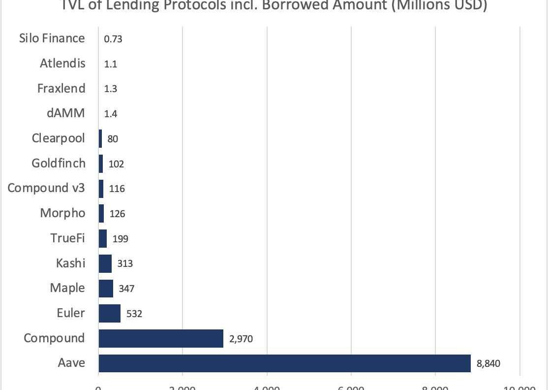 迄今為止,AAVE仍然贏面顯著,部分歸因于其積極推進多鏈部署,其總TVL的37%來自于Layer2與EVM兼容鏈。CompoundV3從V2獲取資金的速度不佳,Compound因此穩居第二名。Maple是最受歡迎的非足額抵押借貸協議。