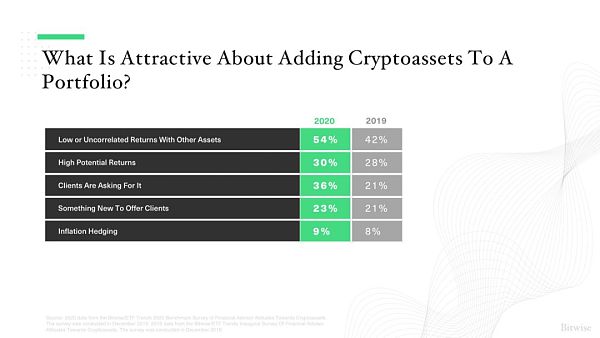在已經將加密貨幣添加到客戶投資組合的投資顧問中,有42%表示將繼續提高加密貨幣的配置比例,剩余的表示將維持目前的比例。在未將加密貨幣添加到客戶投資組合的受調查者中,有7%表示2020年將配置加密貨幣(2018年該調查為3.5%,傳統投資顧問對加密貨幣的興趣和認可度還是有較大提升的)。