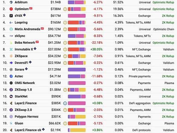 通用型和特定應用型rollup來自https://l2beat.com/rollup提供了一個獨立的執行環境,具有高TPS、低Gas和從第1層訪問所有資產的能力,這有助于區塊鏈上的應用從DeFi擴展到更普遍的領域,如游戲和社交網絡。我們預計rollup將逐漸成為一種提供給Web3應用程序的服務,即RollupasaService。一些項目現在正朝著這個方向發展。以太坊以rollup為中心的路線圖和StarkNet的Layer3架構都展示了特定應用的multi-rollup未來。