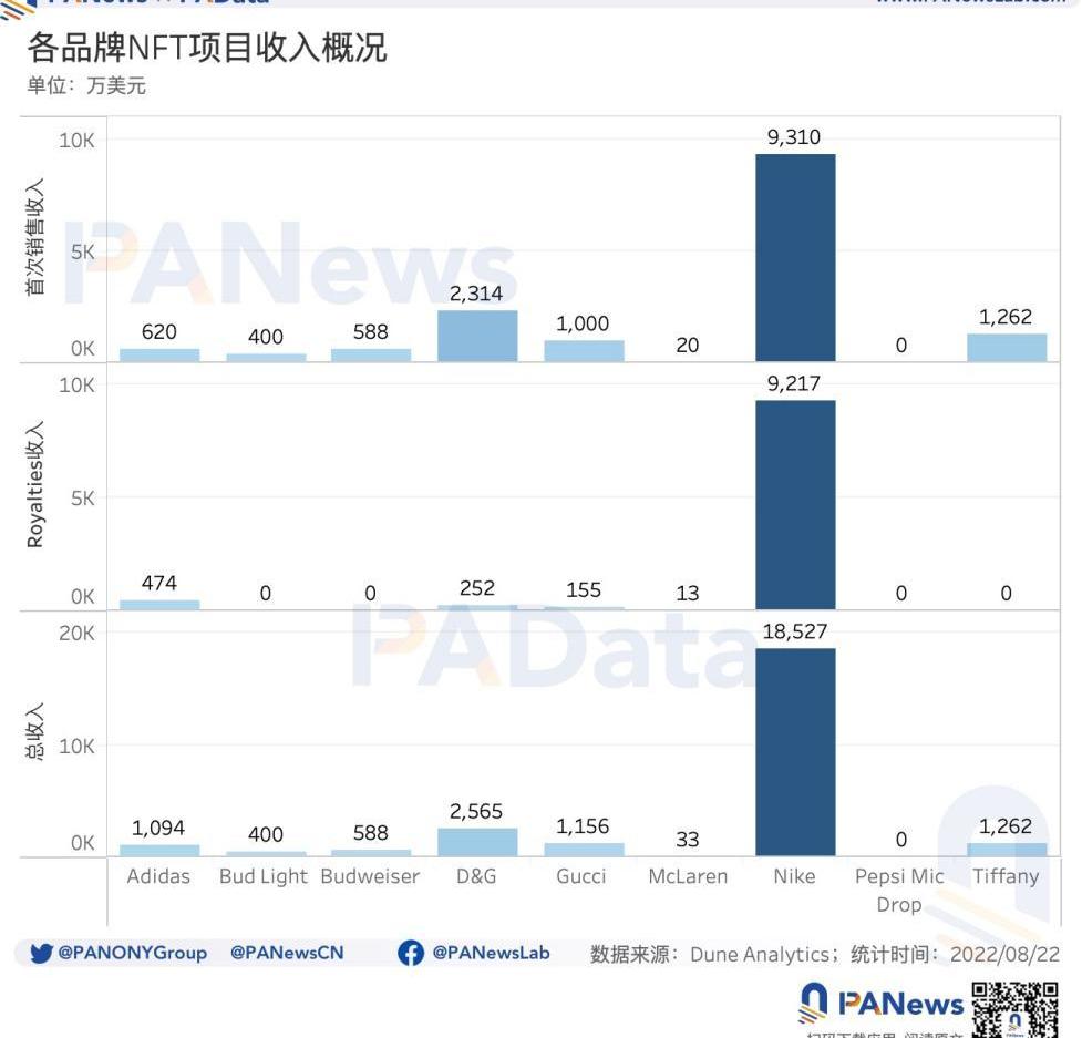 XRP/HKD-5.3%從去年開始,隨著NFT的大火,各大品牌入局NFT的消息也不絕于耳。比如Tiffany面向CryptoPunk持有者推出NFTiffsNFT;耐克旗下加密時尚品牌RTFKT發行了CloneXNFT;Burberry在社交游戲平臺Roblox上推出了手袋NFT允許用戶購買并裝扮數字化身;百威啤酒Legends系列NFT授予持有者一系列線下福利,包括與猶他爵士隊和韋德進行會面、參加慈善活動、獲得韋德虛擬球衣等。除此之外,不少還沒有發行NFT的品牌也在蠢蠢欲動,比如星巴克在財報會議上宣布即將推出以咖啡為主題的NFT;瑪氏為旗下品牌士力架、德芙和M&Ms提交NFT相關商標申請;賓利宣布即將發布限量版NFT等。可以說,NFT如今已經成為連接傳統品牌與加密圈的最佳橋梁,品牌為NFT提供了新的價值,而NFT則為品牌注入了新的活力。那么,這些品牌NFT能否實現品牌、用戶、加密市場的三方共贏?品牌NFT的吸金能力和投資潛力有多大?PANews旗下數據專欄PAData根據公開資料統計了15個品牌共23個NFT項目的基本信息和市場數據,分析發現:1)23個項目中有16個項目采用了ERC-721協議,占比約為70%。但品牌NFT的形式與所屬代幣協議并沒有絕對的關系,一些品牌/產品收藏品也采用了ERC-1155協議。2)23個品牌NFT項目共計發行了96002個NFT。與原生NFT項目動輒發行1萬個相比,品牌NFT的單項發行數量普遍是偏少的。3)23個品牌NFT項目歷史累計持有地址總數達到了57307。與市場中熱門的原生NFT項目相比,品牌NFT的歷史持有地址數量并不少。這或許說明品牌NFT并沒有為NFT市場帶來新的圈外用戶,其規模并沒有顯著高于市場上的原生NFT項目,不過若與一般的原生NFT項目相比,這些品牌NFT更容易受圈內用戶歡迎。4)截至8月22日,Nike發行的NFT在二級市場上的累計總交易量最高,達到了26.27萬ETH。此外Dolce&Gabbana和Gucci的交易量也較高,分別達到了4597ETH和4407ETH。但這些品牌的交易量高度依賴單個項目。5)20個項目的NFT最近30天二級市場上的成交均價的中位數約為0.21ETH。總的來說,Nike的NFT在二級市場中的價格表現更優。并且,空投發行的NFT在二級市場上的成交均價最高不超過0.4ETH,大多都低于以鑄造形式發行的NFT,后者在二級市場上的成交均價最高能達10ETH以上。6)根據隨機抽樣,品牌NFT在5次以內的平均換手收益率約為22.35%,與PAData在去年9月統計的22.65%的平均換手收益率基本接近,也即,品牌NFT沒有表現出超越NFT一般市場水平的盈利能力。01