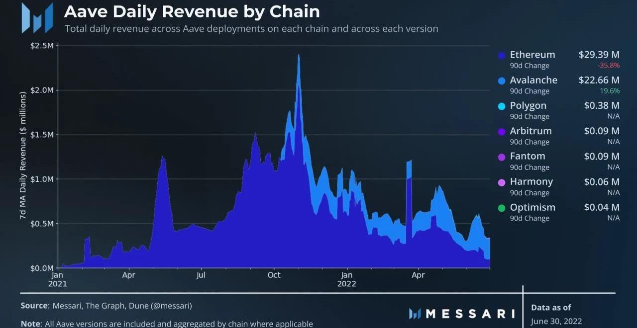 與許多協議一樣,Aave在2022年第二季度也經歷了市場暴跌的考驗。首先,5月份的崩盤引發了大規模平倉。隨后,加密貨幣對沖基金ThreeArrowsCapital的壞賬在6月引發了由Aave最大用戶之一Celsius為代表的中心化借貸機構集中倒閉。隨著價格大幅下跌,借款人的杠桿需求收縮,導致Aave本季度總收入下降18%。5月份Aave贈款計劃的恢復推動了協議使用,并幫助將本季度的凈利潤的萎縮縮小到30%至270萬美元。雖然Aave的總收入在本季度有所下降,但這種下降并未成比例得出現在多鏈市場中。