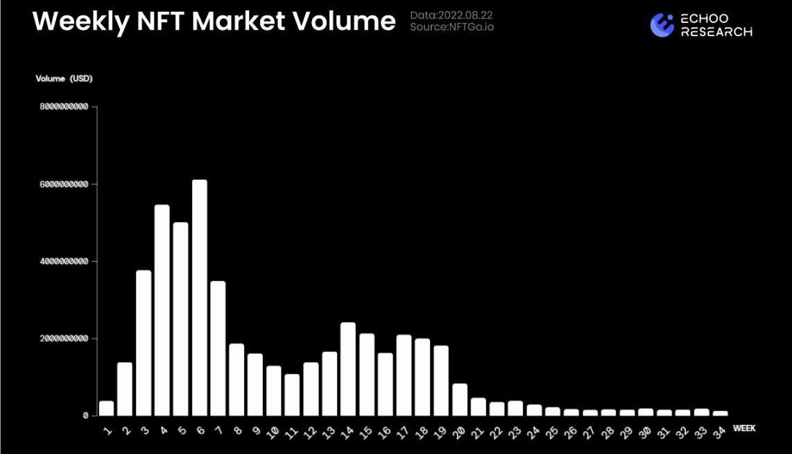 WeeklyNFTMarketVolume(Source:echoo.substack.com)本周NFT交易量較上周大幅下跌,交易量占比最大的OpenSea目前的交易量相比于「牛市巔峰」,已經不足其10%。從較大的時間跨度上來看,整個NFT市場的總交易量依然徘徊在較低區間,并沒有強勢反彈的跡象。自今年5月以來,這樣的趨勢已經持續了14周,我們仍然在等待更強烈的反彈信號出現。