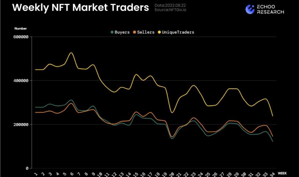 WeeklyNFTMarketTraders(Source:echoo.substack.com)本周參與交易的人數大幅下跌,甚至打破了我們之前幾周提到的“波動規律”,在趨勢維持了10周以后,市場并未好轉,大部分人選擇“減少交易”的策略。目前交易者的數據處于歷史區間的低位,其中賣出者人數略大于買入者人數,這說明:人們對NFT市場的參與度越來越低的同時,在意愿更偏向偏于「賣出」。
