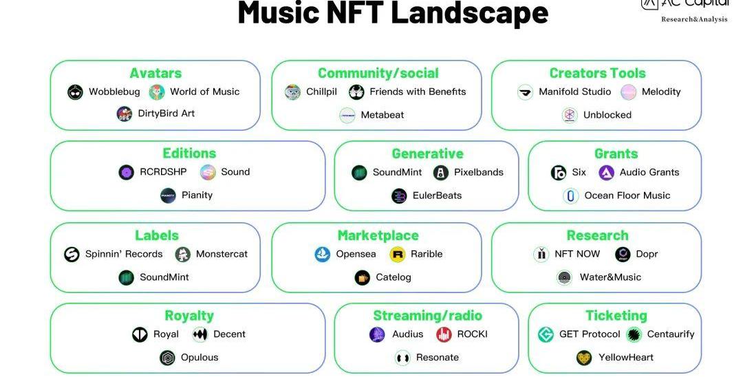 Web3為音樂行業和社區的創新和實驗精神注入了新的活力—Water&Music聯合創始人CherieHuNFT可能是自流媒體引入以來音樂產業所見到的最重大的創新。然而音樂NFT絕對不應該被視為靈丹妙藥。并不能神解決創作者面臨的所有問題,而也絕不應該輕視他,帶來了新的變現模式。新技術正在打破進入部分行業壁壘,音樂NFT重塑音樂產業分配模式,同時音樂NFT音樂可編程、可溯源、可組合、可交易的新屬性正在開辟出目前還不存在的全新服務類別和全新場景,激發更廣泛層面的產品和服務創新,提高整個音樂產業的未來可能性。賽道圖譜如果流媒體時代是頭部音樂人的盛宴,只有播放量高的歌曲才能為音樂人帶來足夠的收益,那么新時代、新技術、新體驗下的音樂NFT就為中部潛力股音樂人帶來了新的機會,幫助更多的音樂人擺脫了流量競爭。因此從音樂NFT用例來說,整個音樂NFT生態從功能屬性上來說,可分為12個大類用例:以下是代表項目Avatars:Wobblebug、WorldofMusic、DirtyBirdArtCommunity/social:FriendswithBenefits、Chillpil、MetabeatCreatorsTools:ManifoldStudio、Melodity、UnblockedEditions:RCRDSHP、Sound、PianityGenerative:SoundMint、Pixelbands、EulerBeatsGrants:OceanFloorMusic、Six、AudioGrantsLabels:Spinnin'Records、Monstercat、SoundMintMarketplace:Opensea、Rarible、CatelogResearch:NFTNOW、Water&Music、DoprRoyalty:Royal、Decent、OpulousStreaming/radio:Audius、ROCKI、ResonateTicketing:GETProtocol、Centaurify、YellowHeart音樂NFT的產品、實用工具、市場等基礎設施正在蓬勃發展,各個項目正在專注于音樂產業蛋糕的重新分配,將音樂的價值還給創作者和用戶,一個用戶友好、使用便捷、社區共同富裕、更加透明的音樂NFT生態正在浮出水面。