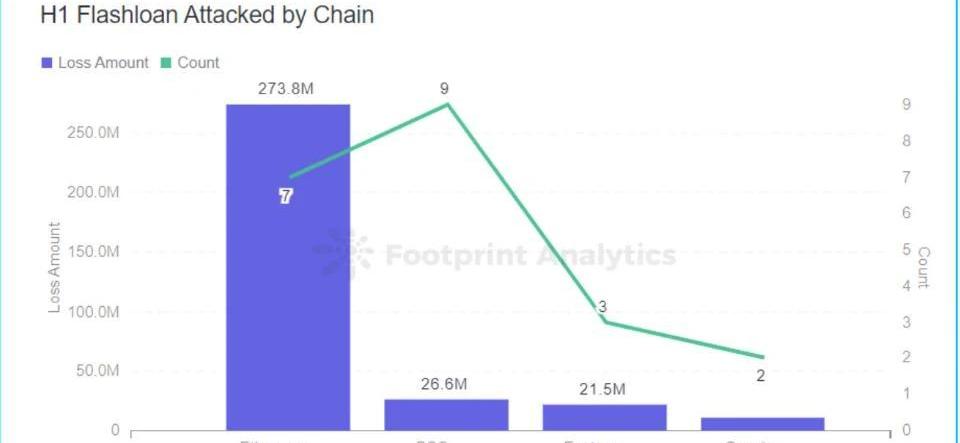 FootprintAnalytics-上半年安全事件數量及損失金額我們可以從以下這組數據看到上半年的Web3安全領域的整體概況:上半年發生7起跨鏈橋攻擊事件,共損失11億3599萬美元;53%的攻擊方式為合約漏洞利用;約26.6%的攻擊方式為閃電貸;上半年共發生5起損失過億的安全事件;整個DeFi市場TVL從1月初的2760億美元跌到了6月末的800億美元,下跌71%;黑客通過TornadoCash共洗錢11億4070萬美元;約71%的攻擊發生在DeFi領域。在第一季度和第二季度的安全報告中,我們已經從各個維度展示和分析了區塊鏈安全領域的總體態勢,包括總損失金額、被攻擊項目類型、各鏈平臺損失金額、攻擊手法、資金流向、項目審計情況等。數據一