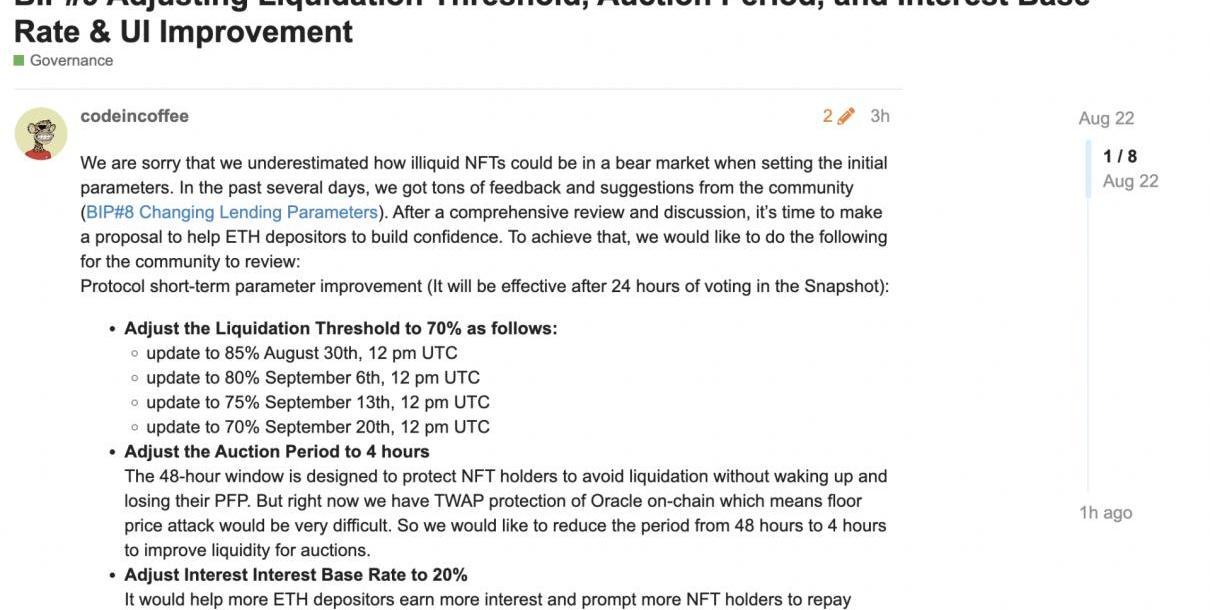 從借款人角度,8月22日數據顯示,BendDAO協議借貸利率達到年化103.71%,這意味著借款人需要償還100%的利息才能拿到原有的NFT,這直接降低了借款人還款的動機。與其贖回NFT后還面臨著NFT資產繼續下行的風險,不如徹底“擺爛”坐等清算。當熱潮短暫褪去,當年炙手可熱的NFT如今卻無人愿意參與拍賣接手。一方面市場情緒悲觀,整體市場下行,以ETH計價的NFT資產跌幅更大。而且根據BendDAO的機制,拍賣參與人員的資金需要鎖倉48小時,在當前的行情下,沒有人愿意“火中取栗”。另一方面,按照規定,拍賣出價需大于NFT地板價95%。這對于拍賣人而言,似乎并沒有太多有利可圖的空間。而按BendDAO的機制,如果拍賣最終未成交,平臺將承擔浮虧或借款人未來償還債務。基于現狀,BendDAO社區于8月22日發布新提案BIP#9,想通過修改部分參數解決流動性危機。包括將清算閾值調整為70%、將拍賣周期調整為4小時、將利息基礎利率調整為20%、以及當發生壞賬時BendDAO社區可投票決定如何處理。當然社區也有議論稱,盡管該提案可能會讓存款人對超額抵押產生一些信心,但也許會導致更多NFT被倉促清算。此外,將在用戶界面中增加顯示ETH浮動壞賬的數量以及在主頁上顯示利息總額。未來協議層面改進包括支持BendDAO中的抵押品報價、盡可能多地接觸交易平臺以支持抵押物掛單等。