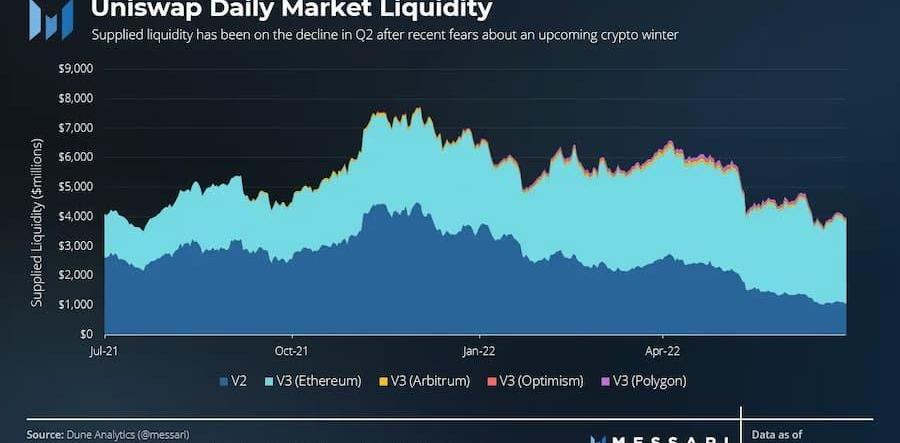 另外,Uniswap上提供的流動性在第二季度下降了37.1%,跑贏了加密市場市值變動,考慮到流動性會在很大程度上受到基礎代幣價格的影響,因此流動性降幅并不算嚴重,相比之下ETH價格在同期下跌近七成。