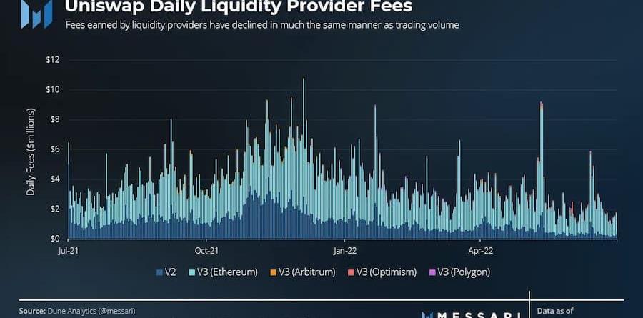 盡管二季度加密貨幣市場市值下降了50%以上,但Uniswap交易量相較前一季度僅下降8.7%,部分是由加密市場的大幅波動性所致;還有一個重要因素是系統中套利機器人的活動,機器人可以占到所有交易量的75%,這是一個健康的跡象。DEX在過去兩年中已經成熟,以至于活動由價格效率驅動,而不是純粹的零售投機。