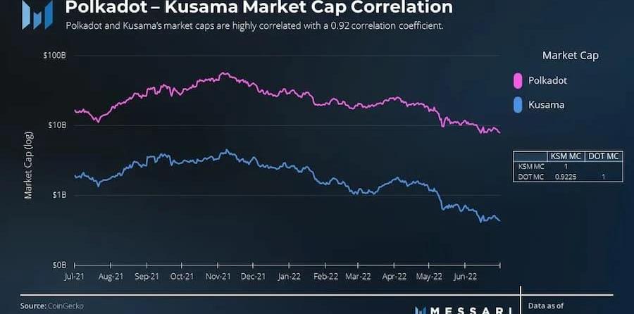 Kusama是Polkadot的先行網絡,在過去四個季度中,兩個網絡的市值密切相關,相關系數為0.92。