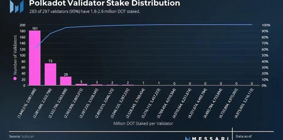 Polkadot使用提名權益證明共識機制。在2022年第二季度末時,297名驗證者中有283名持有1.8-260萬枚DOT,證實了提名者抵押博弈論的有效性。