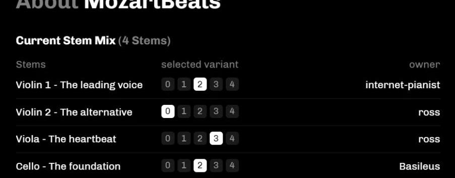 來源:EulerBeats2.3.2Async.Art—突出音樂的可組合性Async.Art將音樂分成了不同音軌,結合了PFP生成藝術的玩法,買家可以購買單一音軌NFT并選擇Stem的狀態,之后master本體音樂呈現的狀態就取決于每一個Stem所有者。如下圖MozartBeats共有四種音軌,每種音軌下有五種狀態,可以組合出625種不同的音樂。其他參與者可以通過購買空白唱片錄音記錄下不同狀態的音樂,唱片分為鉑金唱片,金唱片,銀唱片,稀有度不同但功能相同,錄音之后可以在二級市場售賣。可組合音樂未來或許可以引入稀有度和二次創作等要素,擁有更多元的玩法,而非單個音樂NFT的售賣,收藏單一音軌或layer也可能是另一種收藏策略。