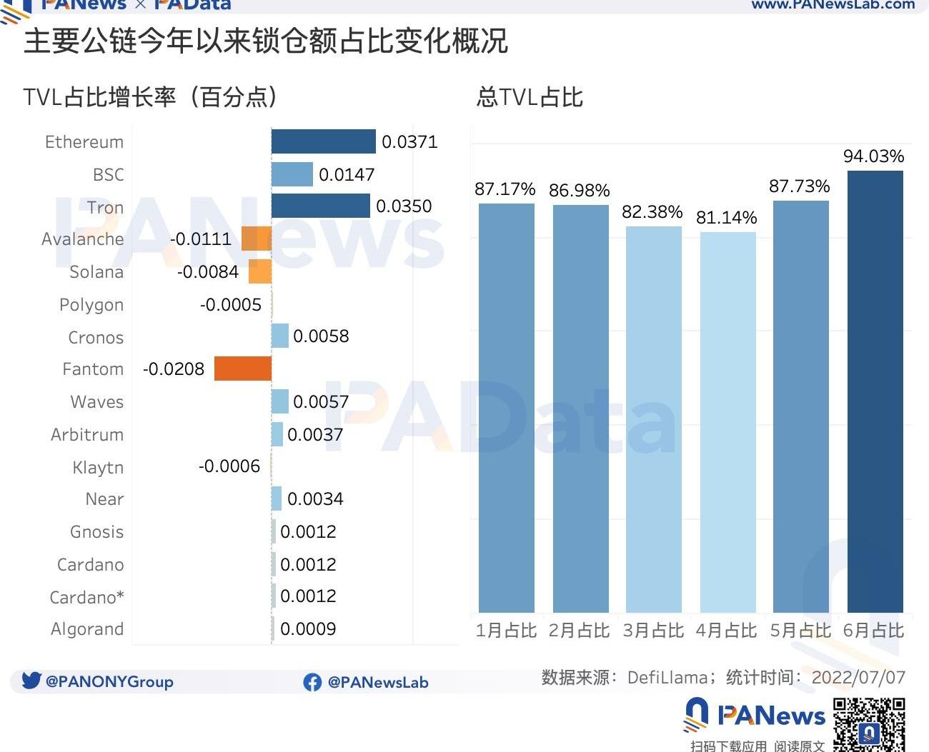 盤點頭部DeFi治理代幣的賦能情況:dYdX一毛不拔,Synthetix悉數奉還底層公鏈與上層協議的協同發展共同推動了區塊鏈技術由虛向實落地。在過去兩年市場向上的時候,公鏈與協議往往是相輔相成的,公鏈代幣與協議代幣通常雙雙上漲,甚至可以說DeFi的發展在一定程度上推動了公鏈的進步。但現在市場向下了,絕大多數資產普跌,流動性危機一觸即發,在這樣的背景下,公鏈與協議會面臨怎樣的局面?公鏈代幣和協議代幣的表現孰優孰劣?為此,PANews數據新聞專欄PAData分析了15條鎖倉額較高且發展較好的公鏈,以及其中鎖倉額最高的5條公鏈上各自鎖倉額最高的5個協議在上半年的流動性變化及其代幣的市場表現。分析發現:1)存量資金向頭部公鏈聚集,15條頭部公鏈的總鎖倉額占比從1月占比87%上漲至6月占比94%,并且存量資金還向其中的Ethereum、BSC和Tron聚集,這3條公鏈的鎖倉額占比分別增長了0.037、0.015和0.035個百分點。2)存量資金向頭部協議聚集,Ethereum上的頭部協議鎖倉額占比上漲了約8個百分點。BSC、Tron、Avalanche和Solana上頭部協議鎖倉額占比則分別上漲了13個百分點、9個百分點、5個百分點和2個百分點。3)頭部協議的平均鎖倉額跌幅基本小于其底層公鏈的總鎖倉額跌幅,結合上一條說明資金向頭部公鏈的頭部協議聚攏。比如上半年,Ethereum頭部協議的平均鎖倉額跌幅比公鏈總鎖倉額跌幅少了約21個百分點。BSC、Avalanche和Solana的情況也類似,頭部協議的平均鎖倉額跌幅比公鏈總鎖倉額跌幅分別少了了約7個百分點、1個百分點和3個百分點。4)除了未發行代幣的公鏈和協議,余下14條公鏈代幣的幣價上半年平均跌幅約為72.21%,20個協議代幣的幣價上半年平均跌幅約為69.65%。總體上看,公鏈代幣和協議代幣的幣價在上半年的表現基本相當,協議代幣的跌幅略小,表現略好。5)但對鎖倉量最高的5條公鏈而言,其中公鏈代幣ETH、BNB、TRX和AVAX在上半年的幣價跌幅都要小于其公鏈上頭部協議的平均幣價跌幅,表現更好。6)14個公鏈代幣的平均最高理論收益約為8.75%,平均最低理論收益則約為-82.05%。20個協議代幣的平均最高理論收益約為15.16%,平均最低理論收益則約為-79.57%。總體而言,兩者都是虧損空間更大,盈利空間更小。但與公鏈代幣相比,協議代幣的盈利空間要多出近7個百分點,而虧損空間則要略小2個百分點,潛在收益表現更好。01