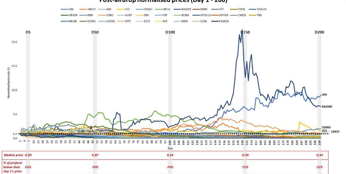 大多數項目(72%)的平均價格繼續低于其發布價格,盡管有一些值得注意的項目表現良好。$UNI發行于2020年9月,和2021年第二季度相比,按日交易量計算,已成為所有公鏈中最主流的DEX。代幣持有者可以參與治理提案,這對代幣空投后的價格來說是有利因素雖然未在圖表中顯示,但目前$UNI的交易價格仍高于其原始空投價格的1.5倍$RAIDER在2021年8月采取了一種非常規的空投方式,該團隊通過成功的NFT銷售開始,并在幾周后在Polygon上發布了第一個版本的P2ERPG游戲。到2022年第一季度,該項目已經建立了強大的社區和龐大的活躍玩家基礎,因而獲得由Delphi、DeFiance、3AC和Polygon共同領投的600萬美元融資這是代幣空投后價格上漲6.5倍的原因然而,加密市場下跌的外部環境對加密游戲行業的打擊最為嚴重,導致其用戶指標不斷減少,目前代幣價格下跌至其原始空投價格的0.44倍雖然$UNI和$RAIDER已經表明空投代幣有可能在更長的時間跨度內表現良好,但總體樣本表明空投通常不會對代幣的長期價格產生有利的影響。創始人希望將項目代幣分配到參與治理、質押或使用它的社區成員手中。根據初始鏈上數據或通過用戶指標進行空投可以有效地空投代幣,如果有傳言稱項目即將進行空投,會吸引很多投機的空投獵人。下圖顯示了每個空投代幣在200天內的價格組合平均數。