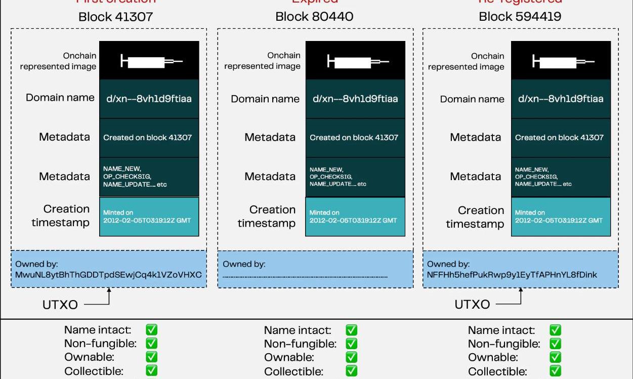 關于NamecoinNFT的爭論集中在「代幣」的所有權。最早的NFT就是NamecoinNFT,在2011年4月21日鑄造的文本內容為「d/bitcoin」的域名成為第一個NFT。Namecoin資產是非同質化的、可擁有的、可轉讓的代幣,這一點沒有具體的爭論。以太坊創始人VitalikButerin在以太坊白皮書的第一頁提到了NamecoinNFT。他在白皮書中使用的是「non-fungibleassets」,而NFT這個詞正式出現是在2017年。NamecoinNFT是第一個NFT在很大程度上是被接受的,更多的爭議是關于到期時間的設定:如果所有者沒有及時續訂他們的域名,九個月之后就會過期。有些人認為如果持有者必須續訂他們的域名,這更像是租賃,而非真正的所有權轉移,違背了Web3的初衷。這種觀點是錯誤的,因為NamecoinNFT為持有者提供了完全的所有權。與租房不同,繼續持有所有權的決定完全取決于業主自己。更新主要是為了維護網絡,需要向礦工支付的極低費用,更像是基礎設施稅。在撰寫本文時,50年的續訂費用約為1美元。關于NamecoinNFT更大的問題是溯源問題,NamecoinNFT過期之后可以重新注冊,這樣就會存在持有人變更的問題。關于NamecoinNFT溯源的技術討論