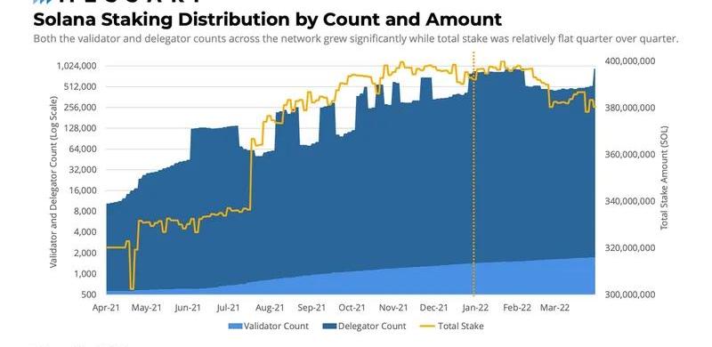 第一季度的質押量相對平穩,平均質押量每季度變化個位數百分點。這種可預測性和總權益量的不波動性通常有利于網絡健康。雖然平均質押量相對持平,但驗證者和委托人的平均數量卻大幅增加。平均驗證者數量從1,255增加到1,579,代表網絡安全參與者增加了25.8%。平均代表人數從426,370人顯著增加至654,279人,增幅為53.5%。對于Solana,委托人被稱為活躍的質押者,以獲得質押獎勵的賬戶數量來衡量。因為大多數錢包只有一個質押賬戶,所以委托人數量是質押個人數量的粗略指標。
