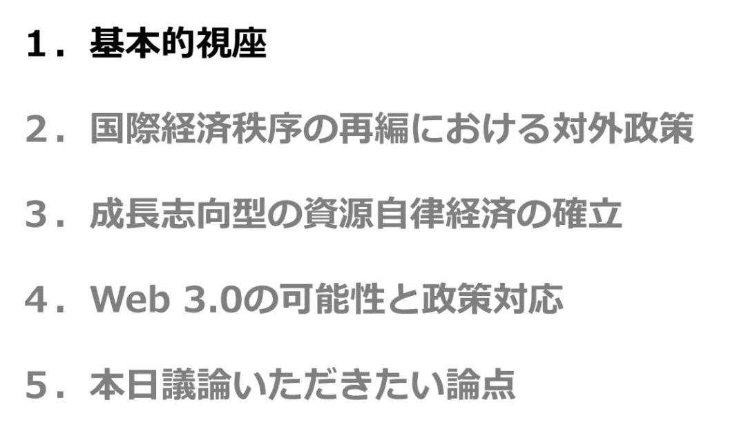 文件的定位根據去年工業結構委員會大會的討論,小組委員會在過去一年,一直在研討新的經濟和工業政策。最近動向/思考包括:①國際局勢對國際經濟秩序產生了新影響,需要厘清日本究竟應該在新的國際局勢扮演怎樣的角色?②新冠病的造成的供應鏈問題,需要嚴防所有商品和資源供應中斷的風險,加強經濟建設。③地理和資源限制,需要在網絡空間開發一個不受地理或資源限制的全新增長領域。目前正在關注Web3.0,因為它不受地理或資源限制的約束,可能成為網絡空間的一個新的增長領域,這些變化正在迎來一個新的的時期,將有可能改變現有的經濟秩序。為進一步發展和深化新的經濟和產業政策,本文件發布的目的是根據最新的數據,提供一些新的觀點。
