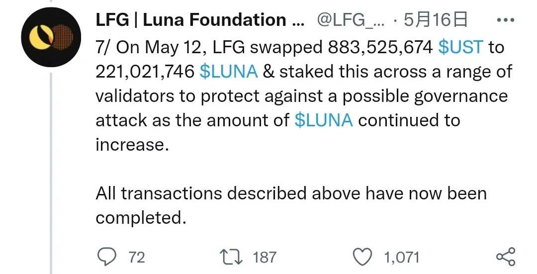 再者,LFG這份言辭含糊的披露也是疑點重重,簡單提出幾點供大家探討。其一,儲備中提到的比特幣otc轉賬,對手方究竟是誰?LFG說是在5月8日向交易對手轉賬52189比特幣,扣除已返還的5313比特幣,總共換得1515689462UST。這筆交易的對手方究竟是誰,LFG應該做出解釋。因為從結果上來,這筆交易也可理解為LFG在用了大部分儲備資金來保護該對手方的利益,且從時間和價格上看是優先、足額的保護。由于涉及資金巨大,這筆交易很難不引人遐思,市場之上甚至已然有了陰謀論的聲音——甚至懷疑Terra私吞。其二,仍然是第一筆比特幣otc轉賬,對手方為什么要返還?還會不會進一步返還?上述交易中有一個細節,交易對手返還了5313比特幣。那么這筆交易究竟是什么性質,LFG也應該進一步說明。究竟是抵押借貸還是出售?還是借貸完后因市場進一步下行而又變成了出售?Odaily星球日報注:關于第一筆比特幣otc交易,LFG9日曾提及“向場外交易公司抵押BTC貸款7.5億美元,以幫助UST重新掛鉤”,此后分兩批將52189BTC轉入了某地址,但該地址幾小時后又將這些BTC轉入了Gemini交易所,僅從這些信息無法判斷判斷具體的貸款或出售細節,也無從得知所謂的“場外交易公司”究竟是誰。其三,為什么要拿UST買LUNA?LFG說是在5月12日將883525674UST兌換為221021746LUNA并進行質押,以防范可能的治理攻擊。這一解釋表面看說得通,因為隨著LUNA的瘋狂增發,Terra的治理趨于失效,所以有必要質押更多LUNA。然而,彼時Terra已選擇了Proposal1164提議的“棄LUNA,保UST”方案,核心思路是盡可能地去吸收市面上過剩的UST供應。順著需要更多質押籌碼的邏輯去想,買LUNA沒問題,但既然已經決定了動用儲備資金,在有其它選擇的情況下為何選擇賣出UST來兌換LUNA,這只會造成更多UST流回市場,與“盡可能吸收過剩供應”的思路自相矛盾。Odaily星球日報注:將UST換成LUNA有兩種可行途徑,一是通過Terra網絡的UST-LUNA雙向“鑄造&銷毀”套利機制執行,通過該途徑執行UST會被銷毀,二是通過交易市場直接兌換,通過該途徑兌換UST仍會繼續在市場上流通。LFG在這筆交易的描述中用的詞是swapped,看起來更像是第二種途徑。