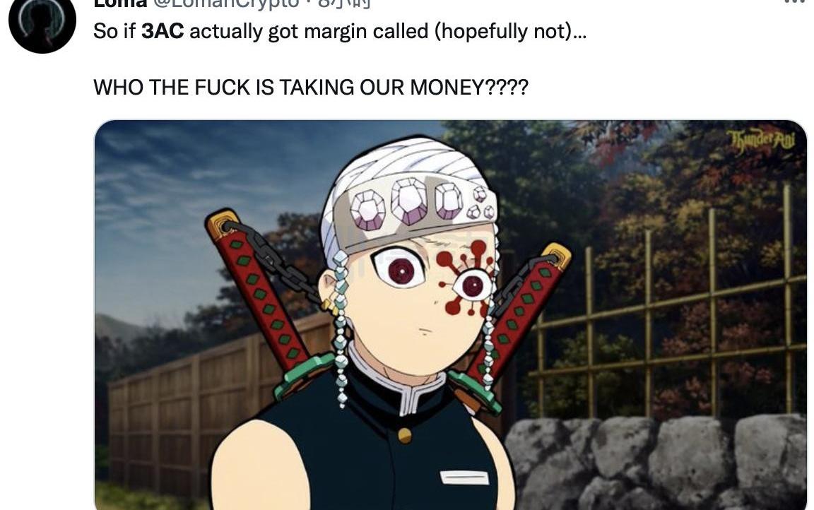 對三箭的清算,也讓更多的機構被迫成了「附帶犧牲品」。昨日早間時候,三箭賬戶下的一個交易機構發文反映三箭從自己的交易賬戶里拿走了100萬美元,顯然是為了填補其他地方的資金缺口。而在今晨,與三箭關系緊密的資本DeFiance似乎也出現了問題,其創始人Arthur在推特上打了一個流淚的表情。