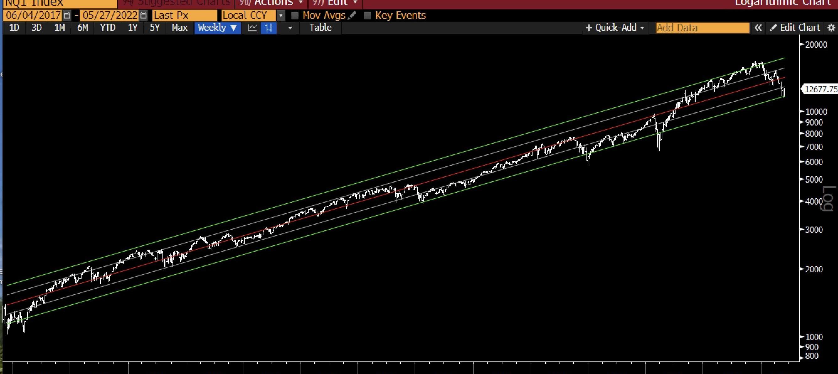 換句話說,納指目前處于對數回歸通道的底部,實際上非常「便宜」,但在峰值中也可以看到更多的下行空間。
