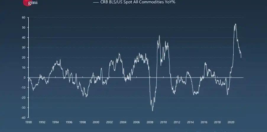 我已經在其他RealVision文章中詳述了這件事,并在GlobalMacroInvestor和MacroInsiders中寫了很多關于通脹的文章。我的觀點是,你在這張圖上看到的1970年代的持續通貨膨脹實際上是人口變化引起的,也就是嬰兒潮一代大規模的人口增長,引發了需求沖擊。同時,1973年和1974年的阿拉伯石油禁運以及1979年的伊朗危機也引發了供給沖擊。但今時不同往日,新冠大流行造成了供給沖擊。大量工廠關閉、貨物停運讓人們不得不以更高的價格獲取原料和商品,于是人們不再投資于大宗商品。因此即便現在世界重新開放,我們也沒有足夠的能力來大規模生產商品。另外,俄烏沖突又進一步加劇了這一趨勢。接下來我將與大家分享我們通脹的未來發展趨勢,以及低增長率和低通脹率對于投資組合、世界經濟以及資產市場會帶來哪些影響。下面這張圖反映的是商品價格同比變化率。雖然通脹率在上升,但其實商品通脹率近期一直在快速下降,并將反映到CPI上。圖中顯示的是所有商品的同比變化情況,但其中我們一直很關心的其實是食品類商品。