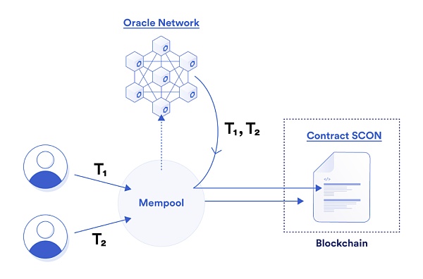 FSS(Fair Sequencing Service)是由Chainlink提出的MEV防范方案。簡而言之,FSS讓用戶首先將交易發送至專門的智能合約SCON中。Oracle網絡觀察內存池中的這些交易,按照其到達內存池的時間(或其他特定的順序)進行排序,排序完成后再將其轉發給SCON,如下圖所示。
