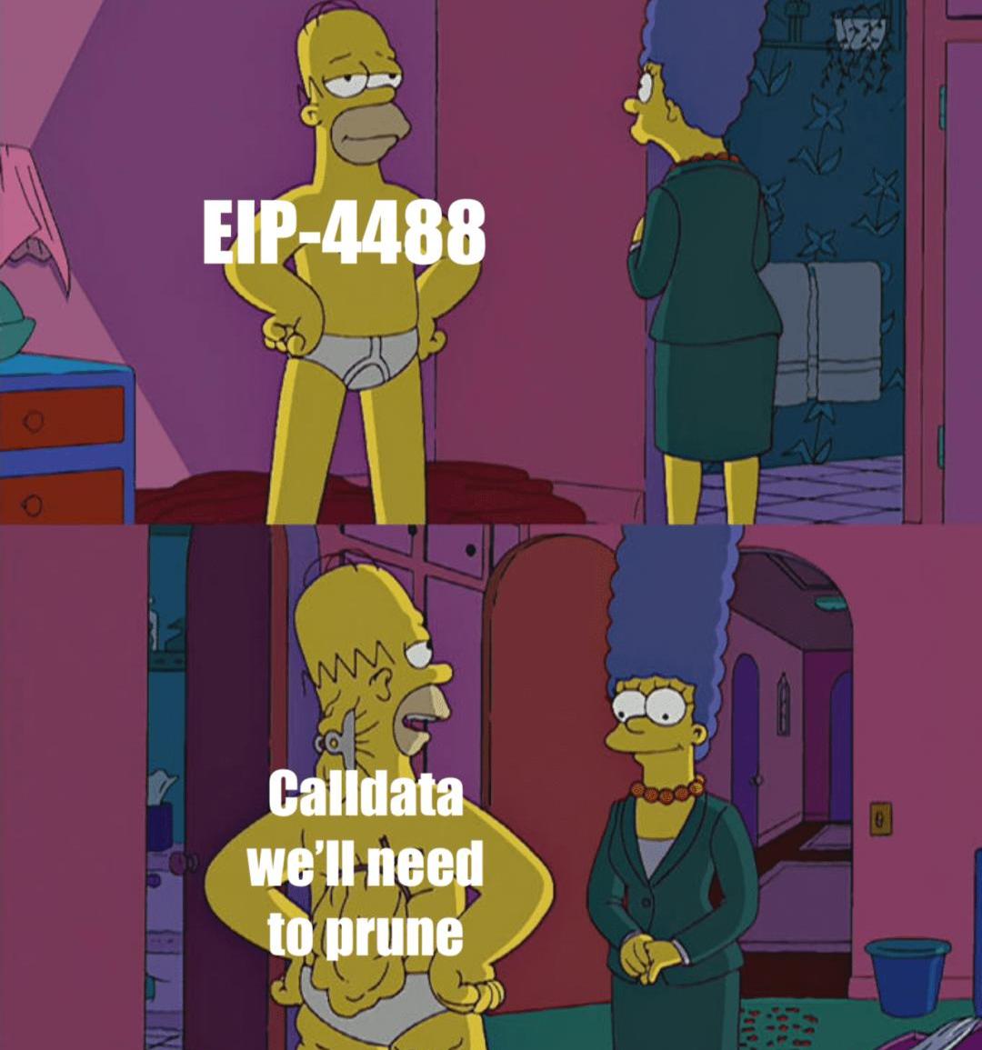 DS很棒,但我們必須要有耐心。PDS是來幫我們渡過難關的——它在一個緊湊的時間表上實現了必要的向前兼容的步驟,以便在過渡期間提供數量級的擴展。然而,它實際上還沒有實現數據分片。今天的rollup使用L1calldata進行存儲,它可以在鏈上永存。不過,rollup只需要在一些較短的時間段內使用DA,因此,任何感興趣的人都有足夠的時間來下載它。EIP-4844介紹了新的攜帶blob的交易格式,其中rollup將用于未來的數據存儲。Blob攜帶大量的數據,它們比類似數量的calldata便宜得多。數據塊在一個月后將從節點上修剪掉,這就降低了存儲需求。使得有足夠的時間來滿足我們的DA安全假設。
