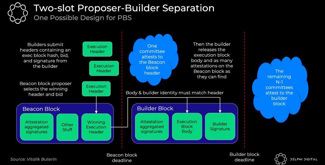 今天的共識節點和合并后的共識節點分任不同角色。他們建立實際的區塊,然后將其提交給其他共識節點,由其進行驗證。礦工通過在上一個區塊之上進行“投票”,而在合并后驗證者將直接對區塊進行有效或無效的投票。PBS將這些分割開來——它明確地創建了一個新的協議內建設者角色。專門的建設者將把區塊放在一起,并為發起者選擇他們的區塊而出價。這可以對抗MEV的中心化力量。回顧Vitalik的“終局”——所有的道路都通向中心化的區塊生產,并進行無需信任和去中心化的驗證。PBS對此發揚光大。我們需要一個誠實的建設者來服務于網絡的有效性和審查阻力,但驗證者組需要誠實多數。PBS使發起者的角色盡可能簡單,以支持驗證者的去中心化。建設者收到優先費提示,加上他們可以提取的任何MEV。在一個有效的市場中,有競爭力的建造者會出價到他們能從區塊中提取的全部價值。所有的價值都會滲透到去中心化的驗證者組中——這正是我們想要的。具體的PBS實現仍在討論中,但雙槽PBS可能是這樣的: