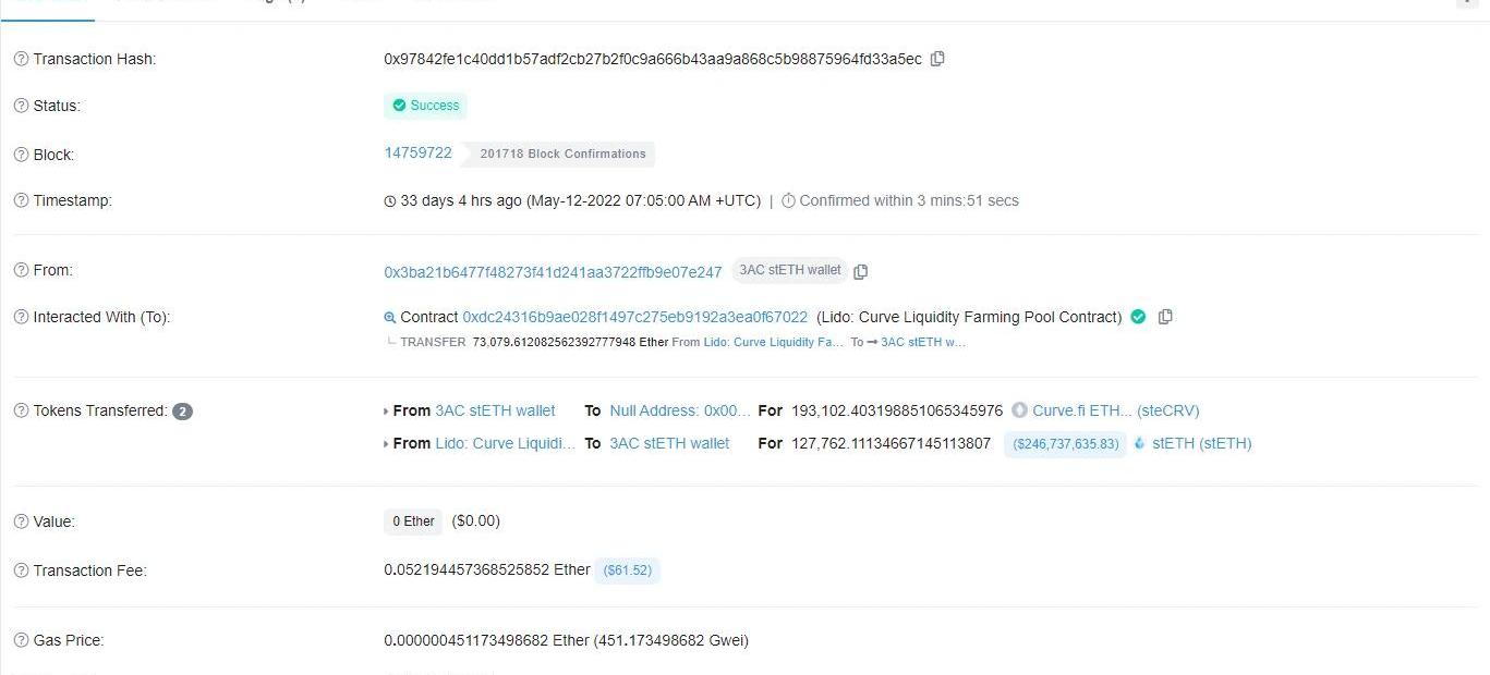 作為一個曾管理上百億美元的投資機構,在未經合作方授權的情況下劃轉資金,不免引發眾人猜想。難道一向“財大氣粗”的三箭資本流動性枯竭了?事實上,此前市場就有傳言,三箭資本疑似因市場暴跌出現運營和償付問題。自5月LUNA崩盤后,三箭資本就一直在頻繁操作。其先后向FTX、Bitmex轉入巨額ETH,截至目前已轉出約162,629枚ETH。同時,三箭資本還在拋售stETH。在stETH“脫鉤”至0.94ETH時,三箭資本從Curve中抽出了12.7萬枚stETH的流動性。