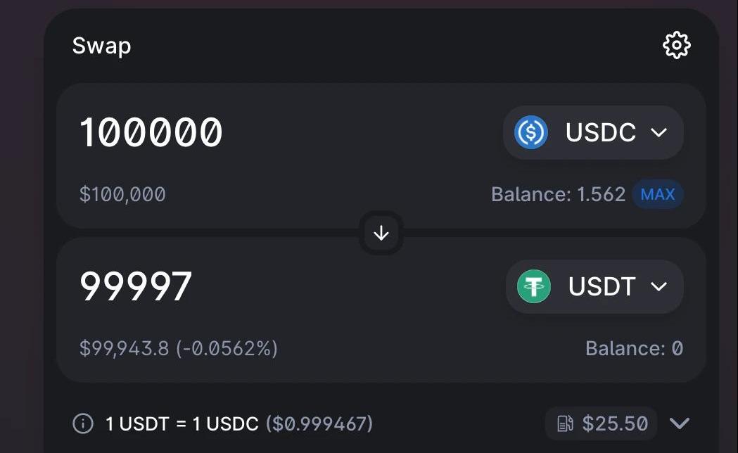 當前Curve3-pool中USDC+USDT的TVL為$1.95B美金,UniswapV3USDC/USDT交易池的TVL為$217.43M美金,前者約是后者的9倍。如果我們以當前的真實交易情況做對比,以分別代表巨鯨和散戶單幣交易份額的100,000美金和1,000美金USDC/USDT交易為例: