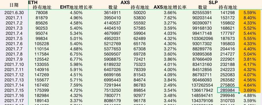 2021年7月15日,SLP的持幣地址數為28.5w個SLP地址增長率連續多日在4%以上。兩者的持幣地址增長率都處在高速增長的階段。注:目前Stepn是采用邀請碼機制,用戶每運動50分鐘才能產生一個邀請碼。