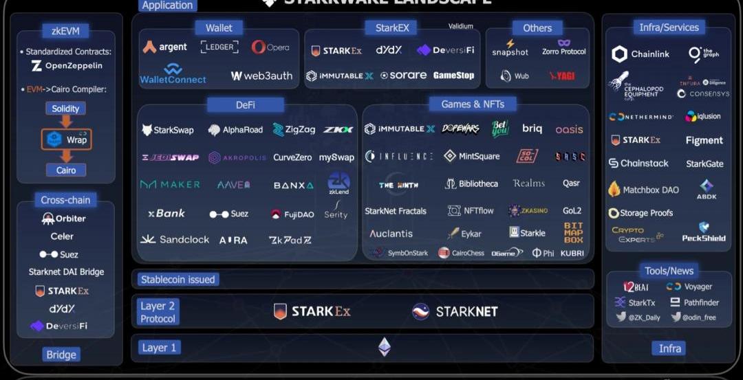 L2生態價值流動圖目前在各個流動性節點,StarkWare和zkSync都有相應的應用部署,大部分處于測試階段,其生態對比情況如下圖。