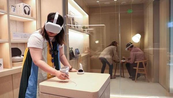 上圖:Meta產品營銷經理YuxiWang在于2022年5月4日在「MetaStore」實體店內演示了將oculus耳機與HorizonsWorkRooms一起使用的場景。