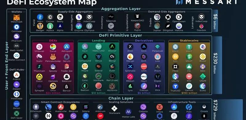 DeFi生態的底層是公鏈層。以太坊、Solana和Avax等智能合約提供了DeFi運行的基礎設施。此外,還有一些可提高基礎智能合約交易速度和效率的擴展方案。基礎設施工具完善了這一層,并為DeFi應用程序提供了對網絡、數據甚至流動性的API訪問。二、中層:DeFi核心層