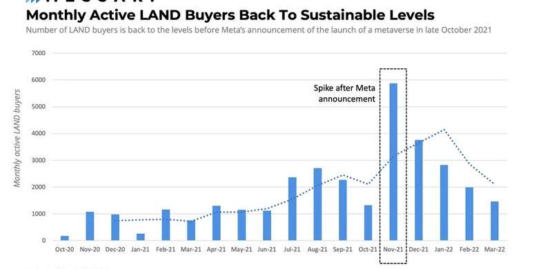 在使用方面,TheSandbox于2022年3月推出了其游戲AlphaSeason2。值得注意的是,在此發布期間,TheSandbox的注冊用戶達到了200萬。考慮到發布持續了四個星期,此時跟蹤其每日或每月活躍用戶并沒有用處。相反,獨特的LAND購買者可能是對LAND效用的興趣的替代代理。相反,獨特的LAND買家可能是對LAND效用感興趣的另一種代表。