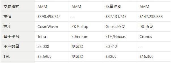 MMF有自己的貓鼬NFT,發行價是399CRO,截至2022/04/14地板價是8887CRO,漲幅達到了20倍左右。單個NFT可以為farm增加3%的年化,單個地址單個farm池最多添加3個NFT,即為挖礦年化+9%。團隊之前也在ETH公鏈上發行了同款NFT---MadMeerkat,地板價目前是6.29Eth。總的來說,MMFinance從開發時間來說屬于早期步入成熟期的項目,再加上獨特的回購機制與協議流動池用于維持代幣價格的穩定性和市值可持續增長性,使得其成為了Cronos公鏈上的第一大DEX,未來預計會完成其他公鏈的部署,并嘗試與其他Defi協議進行合作來擴大生態影響。橫向對比