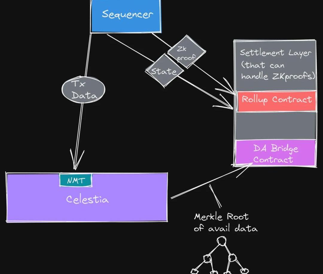 也有可能既不使用純粹連接到Celestia的結算層進行橋接,也不使用主權rollup功能。由于Celestia只是為底層DA層提供共享安全,所以只要Celestia能夠將可用交易數據的Merkle根發送到一個結算層合約,就可以使用任何結算層。這意味著,如果需要,任何結算層都可以用于rollup。那么他們為什么要這么做?許多現有的結算層,如以太坊,已經有了一個繁榮的生態系統。因此,已經有了流動性和用戶可以利用。對于不希望依賴于從頭構建整個生態系統的rollup,這是特別有利的。現在,這不僅僅局限于作為結算層的以太坊。例如,你還可以將Mina用作ZKrollup。這意味著你可以將你的交易數據發送給Celestia,同時將狀態更新和zk-proof發送給Mina。通過這樣做,你已經擁有了一個默認證明有效性的結算層。如果你是一個rollup運營方,想要利用流動性和使用其他區塊鏈的用戶,那么這種類型的解決方案對你非常有吸引力。它也可能成為一種即插即用類型的rollup運營方。你可以把不同的排序器插到不同的結算層上。例如,一個ZKrollup排序器可以連接到Mina并提供狀態更新和有效性證明。而另一個不同ZKrollup上的排序器可以通過Quantum連接到以太坊進行結算。他們的共同點是,他們會把所有的交易數據發送給Celestia,然后Celestia會在結算層操作一個智能合約或類似的合約,在那里它會發送一個可用數據的Merkle樹。讓我們以ZKrollup為例,看看它在架構上是如何實現的: