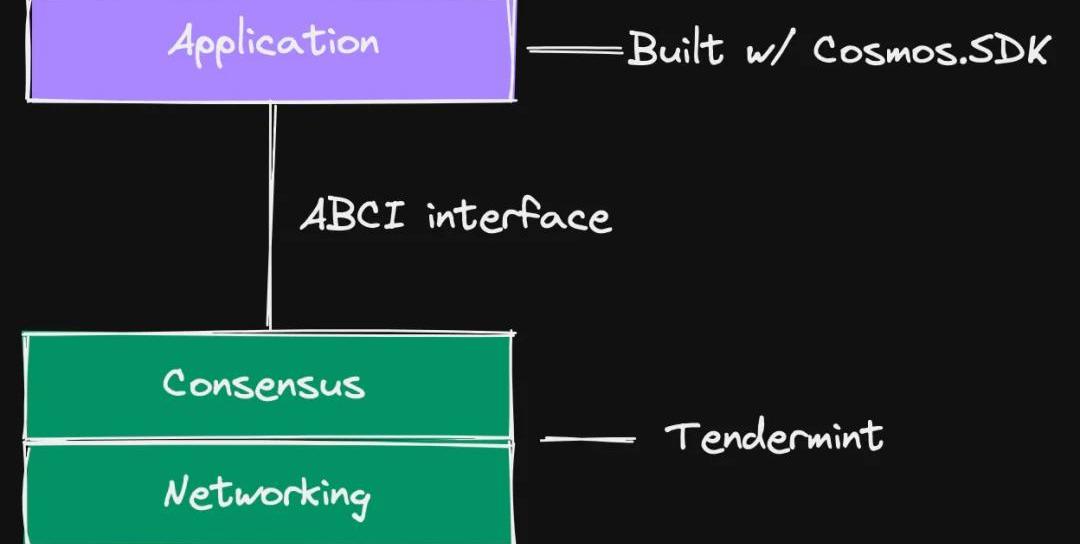 子網擁有一組獨立驗證自身網絡的新驗證者。所有Avalanche子網都會自行負責共識、數據可用性和執行。每個子網也將有自己的Gas代幣,由驗證者指定。目前已上線的子網的一個例子是DefiKingdoms子網,它使用JEWEL作為其Gas代幣。在我們繼續看Celestia的架構之前,讓我們先看看Cosmos。Celestia在很大程度上借鑒了Cosmos,并將通過IBC與之進行大量互動,因為它也是用CosmosSDK和Tendermint的一個版本Optimint構建的。Cosmos架構與目前其他架構有很大不同,因為它使dApps成為區塊鏈本身的應用,而不是提供一個虛擬機。這意味著一個主權的CosmosSDK鏈只需要定義它所需要的交易類型和狀態傳統,同時依靠Tendermint作為其共識引擎。Cosmos鏈拆分了區塊鏈的應用部分,并使用ABCI將其連接到網絡和共識。ABCI是將區塊鏈的應用部分連接到提供共識和網絡機制的Tendermint狀態復制引擎的接口。它的架構通常是這樣宣傳的: