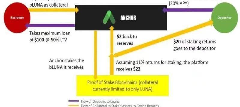 UST是加密世界最大的算法穩定幣,它沒有資產支持并通過Luna交換機制來穩定維持其價格。此前,有大量投資者涌向Anchor協議并通過存款以獲得19.5%的APY,這將UST的流通供應量從一年內的20億美元猛增至185億美元的高位,因為投資者需要UST進行存款。批評者稱Anchor協議不可持續,因為其產生的收入無法與支出相平衡,兩方的虧空依靠國庫長期輸血。Terra穩定幣UST高達19.5%的APY收益率成為了Anchor快速增長的關鍵。而在能夠保持UST價格錨定美元的同時提供這一利率,是通過基于Anchor的借款機制實現的。本文將闡述Anchor的借貸機制是如何運作的,該協議的最新現狀及目暴露出來的問題。1.\t借款機制
