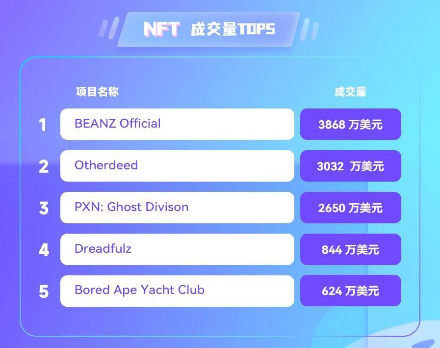 按過去24小時成交量,排名前五的項目分別為BEANZOfficial、Otherdeed、PXN:GhostDivison、Dreadfulz和BoredApeYachtClub。