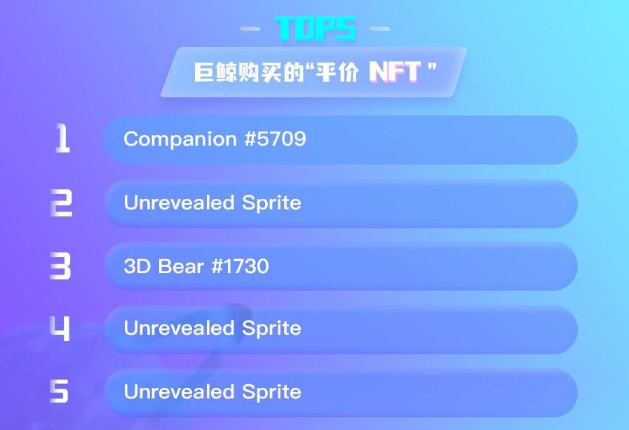 過去24小時,巨鯨購買的“平價NFT”中排前五的分別是:Companion#5709、UnrevealedSprite、3DBear#1730、UnrevealedSprite和UnrevealedSprite。