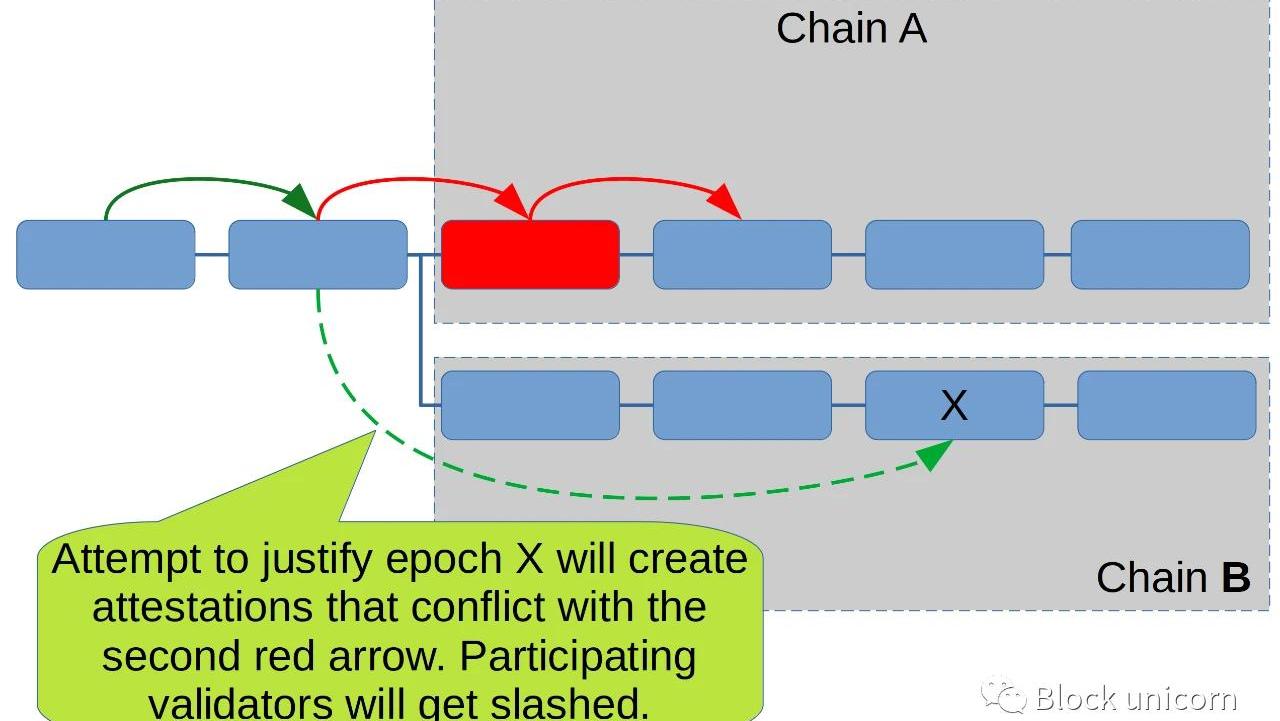 這一節是為那些想要更詳細地了解為什么有錯誤的客戶端不能簡單地切換回來而不得不遭受可怕的無活動泄漏的人而設計的。為此,我們必須看看CasperFFG最終確定是如何工作的。每個證明都包含一個源檢查點和一個目標檢查點。檢查站是一個紀元的第一個區塊。如果存在從一個紀元到另一個紀元的鏈接,而該鏈接的投票總數超過所有利害關系的2/3(即,有如此多的證明,其中第一個檢查點為“源”,第二個檢查點為“目標”),則我們將其稱為“超級多數鏈接”。一個紀元可以是“合理的”,也可以是“確定的”,它們的定義如下:1.紀元0是對齊的。2.如果與一個合理的紀元有絕對多數的聯系,那么一個紀元就是合理的。3.如果(1)紀元X是對齊的,并且(2)下一個紀元也是對齊的,且絕大多數鏈接的源是紀元X,則紀元X被最終確定。規則3略有簡化(有更多的條件可以最終確定一個紀元,但它們對本討論并不重要)。現在,讓我們來看看大幅削減的條件。大幅削減證明有兩條規則。兩者都比較一對證明V和W:1.如果V和W的目標是相同的紀元(即相同的高度),但它們不投票給相同的檢查點(雙重投票),則它們是可以砍掉的。2.這意味著(1)V的源早于W的源和(2)V的目標晚于W的目標(環繞投票)。第一個條件是顯而易見的:它防止簡單地投票給同一高度的兩個不同的鏈。但是第二個條件有什么作用呢?它的功能是削減參與最終確定兩個沖突鏈的所有驗證器(這永遠不應該發生)。要了解原因,讓我們再次查看我們的場景3,在最糟糕的情況下,有錯誤的客戶端占絕對多數(>2/3的質押)。當它繼續投票給有故障的鏈時,它將最終確定具有無效塊的紀元,如下所示: