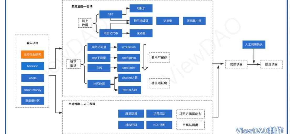ViewDAO整體監控系統邏輯圖從左到右的主體邏輯是:對市場上海量的游戲項目通過漏斗的方式逐層篩選,最終過濾出可以投資的項目。項目的發現維度是數據自動監控和主動投入兩種方式,對于數據自動監控而言,模型/規則可以通過分析過去成功的項目獲得,觸發規則代表可以進行人工調研。對于主動投入的項目則可以從主動行業研究、hackson、whale、smartmoney及高質量的社區中獲得。目前,我們在不斷更新、完善ViewDAO的監控模型,我們會適時的將監控發現的投資項目分享在Twitter上。5.2尋找