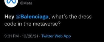 近兩年由于COVID-19的疫情影響,無數人被迫困在家中,人們把時間花在虛擬世界中,這加快了時尚數字化的進度。在2021年10月,扎克伯格宣布將公司改名Meta后,讓許多人第一次聽說了元宇宙。時尚第一時間成為元宇宙中的話題,各家大廠也紛紛入場。