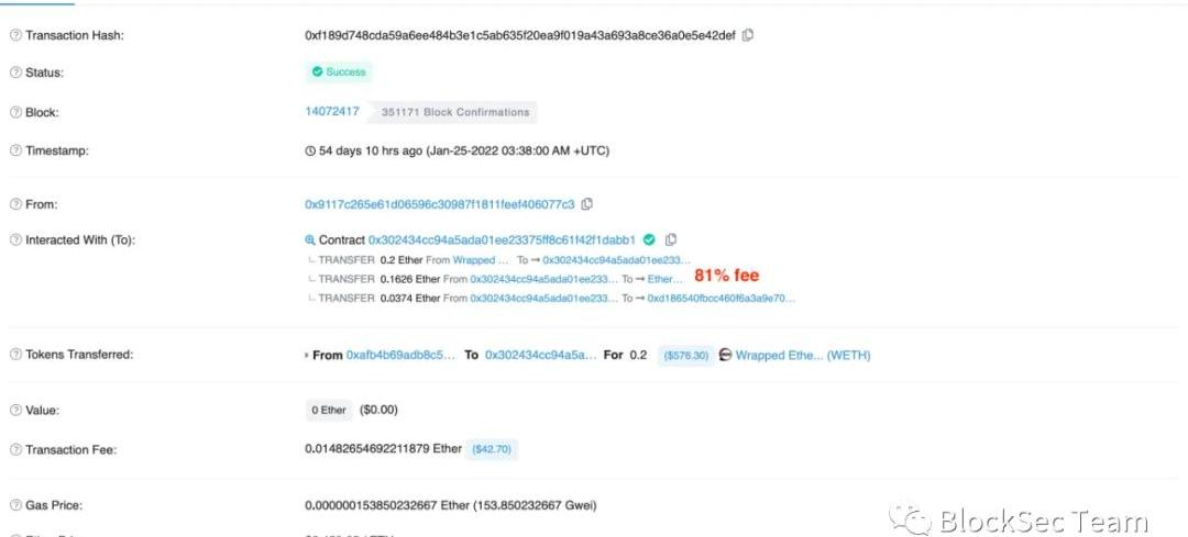 在整個救援過程中,我們先后被12個同樣利用Flashbots的競爭者擊敗,包括2個救援賬戶和10個攻擊賬戶。我們設置Flashbots費用的策略相對而言是較為保守的。具體而言,為了保護受害者的利益,我們總是傾向于盡可能較少地設置Flashbots費用。因此除非已經有成功地使用Flashbots的攻擊交易出現,我們并不會主動地使用Flashbots或增加Flashbots費用。比如一個成功的攻擊交易設置的Flashbots費用比例為10%,我們可能會在下一次救援交易中將之設置為11%。但是,結果證明這樣的策略并不太成功,攻擊者通常會采用較為激進的策略設置費用以贏得競爭,例如:圖5展示了區塊高度為14071986的一筆攻擊交易,攻擊者0x5738**將比例設置為70%。圖6展示了區塊高度為14072255的一筆攻擊交易,白帽0x14ca**將比例設置為79%。圖7展示了區塊高度為14072385的一筆攻擊交易,白帽0x14ca**將比例設置為80%。圖8展示了區塊高度為14072417的一筆攻擊交易,白帽0x9117**將比例設置為81%。圖9展示了區塊高度為14073395的一筆攻擊交易,攻擊者0x5738**將比例設置為86%。