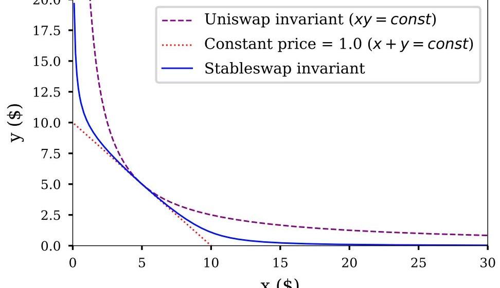 盡管Uniswap的恒定乘積公式很優雅,但也存在一些缺點。Uniswapv2的低效之處在于,不同類型的錨定資產之間的互換不適用該模型,比如穩定幣,理論上這些資產應該以1:1的匯率兌換。例如,大多數的DAI和USDC都以0.99-1.01之間的匯率完成兌換交易,所以Uniswapv2中的DAI-USDC池僅使用了可用總資本的約0.5%。此外,交易者會遭遇很高的價格滑點。在撰寫本文時,交易員試圖通過Uniswapv2將100萬USDC兌換成DAI,這會導致2.4%的價格滑點,因此僅能兌換到約97.6萬DAI。針對穩定幣互換更合適的定價公式應為恒定加和公式(x+y=k),其中一種資產與另一種資產的價格相關系數始終為1。例如,在恒定總和k=10,000的USDC-DAI池中,存入500USDC的用戶將獲得500DAI作為回報,因此k維持10,000不變。然而,上述模型的問題是流動性池存在被完全提空的可能性。最初由50%USDC和50%DAI組成的池最終可能僅剩一個代幣。相比之下,將恒定乘積公式也適用于穩定幣互換的一個好處在于,流動性池中的儲備不可能被完全耗盡。Curve的穩定幣互換公式在以上兩種方法之間的找到了平衡。其StableSwap機制公式包含一個動態變量,該變量隨流動性池的余額變化調節價格。當流動性池余額大致平衡時,池中價格會在恒定加和公式基礎上上下浮動,提供接近1美元的穩定價格。當流動性池余額不平衡時,計價更像是遵循恒定乘積公式,使得加劇池余額失衡的交易行為會更貴,以此鼓勵流動性提供者幫助該池恢復平衡。在下圖中可以更加直觀地看到,Curve的StableSwap機制恒定值位于Uniswap恒定值和恒定加和公式恒定值之間。CurveStableSwap機制的恒定值