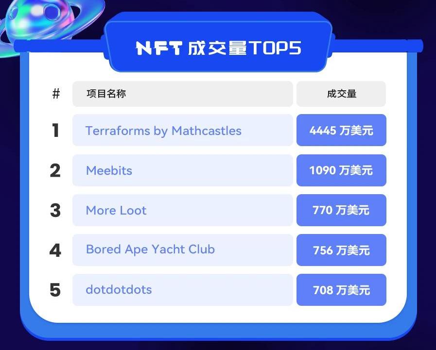 按過去24小時成交量,排名前五的項目分別為TerraformsbyMathcastles、Meebits、MoreLoot、BoredApeYachtClub和dotdotdots。
