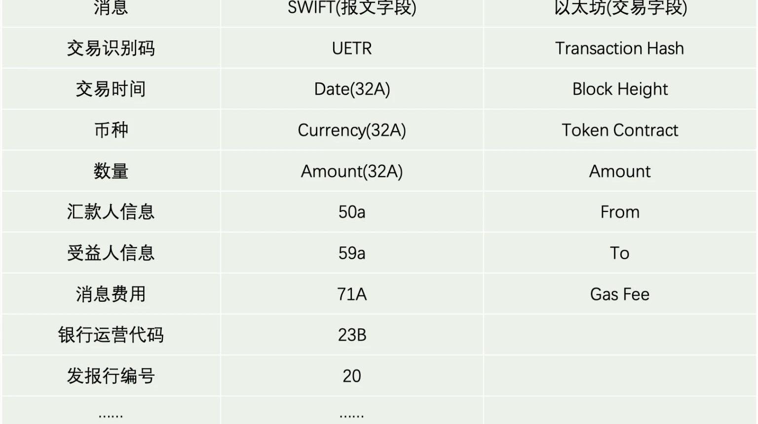 SWIFT在跨境支付中的作用國際支付清算體系包括信息流和資金流兩大部分,即跨境記賬部分和跨境轉賬部分。SWIFT網絡實際上并不負責資金的劃轉和清算,而是使用SWIFTCode在銀行之間發送支付指令。SWIFTCode由8~11位英文字母和阿拉伯數字組成,用來唯一標識系統中的金融機構。比如招商銀行北京分行的SWIFT代碼為CMBCCNBS201,前四位(CMBC)代表金融機構,中間(CN)兩位是國家代碼,最后幾位(BS201)代表金融機構分支。資金的清算、結算由各國的支付系統承擔,而SWIFT的作用,就是將各國的跨境支付體系和其他國家的系統連接起來,實現跨境支付清算的目的。在SWIFT系統中的一條報文就如同向區塊鏈網絡中發送一筆交易。如同以太坊上不同類型的代幣(ERC20,ERC721)有不同的標準,SWIFT報文根據業務類型的不同也會有不同的模板,我們以用于個人客戶之間的資金劃轉的MT103報文為例,簡單對比一下SWIFT和同為賬戶系統的以太坊發送的交易信息之間的關系,如下表。
