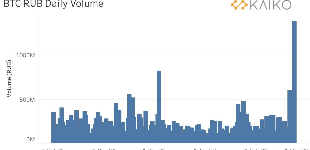 在2月24日俄烏在邊境發生軍事沖突后,次日烏克蘭最大加密貨幣交易所Kuna的USDT和BTC都出現了明顯溢價,USDT價格最高為$1.24,而BTC則每枚溢價$3100。2月27日烏克蘭副總理米哈伊洛·費多羅夫向所有主要的加密貨幣交易所平臺提出要求,封鎖俄羅斯加密貨幣用戶的地址。但遭到了加密社區和交易所的集體拒絕,原因是這種做法既背離了加密社區去中心化的初衷,又讓交易所失去信譽,顯然費多羅夫的想法有些天真了。在被SWIFT除名后,超過1000BTC的數量激增,盧布與USDT之間的計價交易量達到2940萬美元,為9個月以來最高水平,一周內增長了兩倍多。另外,俄羅斯交易所的BTC出現溢價,3月1日BTC單價達到$61346/枚,溢價達到1.8萬美元,有明顯的法幣資金出逃跡象。